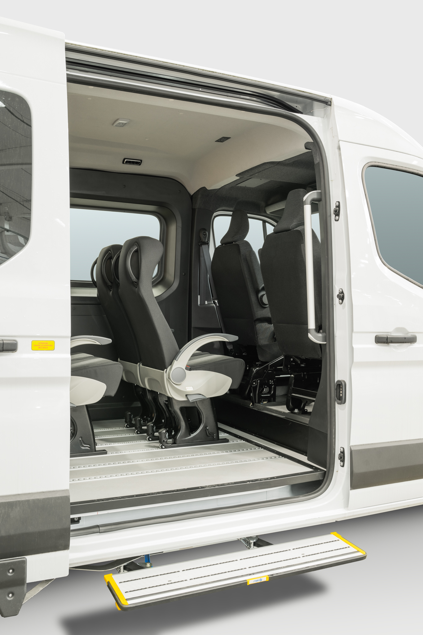 Der Renault Master mit Doppelarm-Hublift ist für den sicheren und effizienten Transport von Menschen mit Behinderung konzipiert. Er kann so konfiguriert werden, dass bis zu drei Rollstühle im hinteren Bereich Platz finden. Der elektrohydraulische Hecklift ermöglicht einen sicheren und zuverlässigen Zugang, auch bei größeren Rollstühlen. Er bietet eine effiziente Mobilitätslösung für unterschiedliche Einsatzanforderungen.