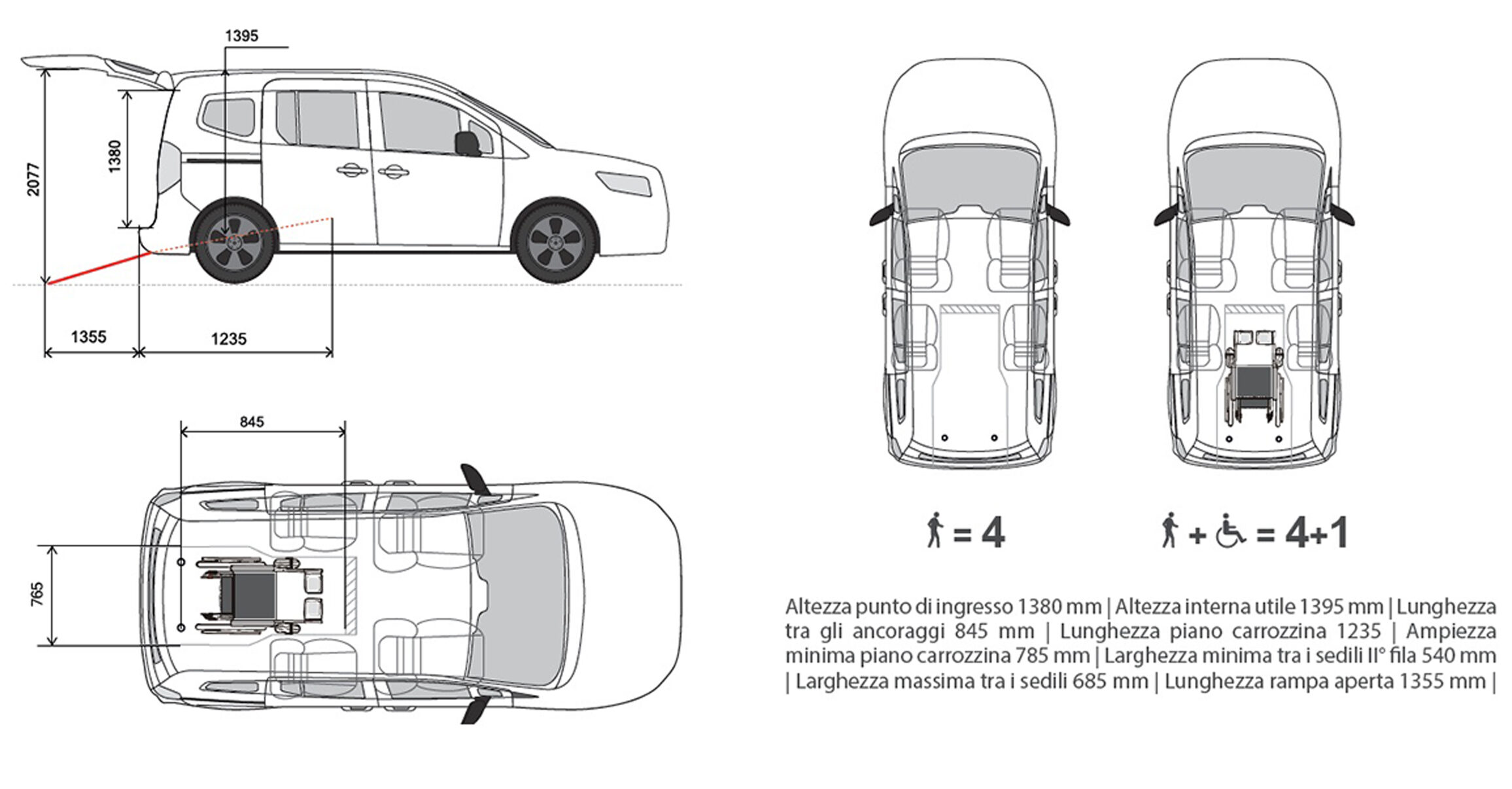 Le véhicule Nissan Townstar F-Style à plancher abaissé est conçu pour le transport d’une personne en fauteuil roulant et jusqu’à 4 passagers. Compact et maniable, il garantit un accès facile et sûr grâce à sa rampe manuelle intégrée, ses ancrages homologués et la possibilité d’installer un treuil électrique. L’intérieur se distingue par son confort, son esthétique soignée et la qualité de ses matériaux.