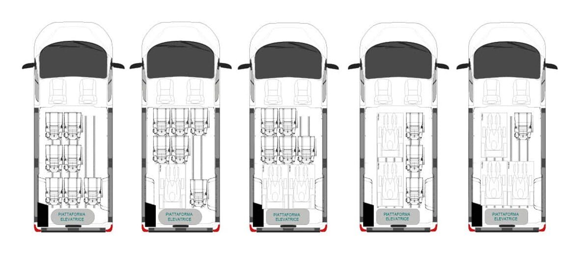 Le véhicule Opel Movano F-Style avec plateforme élévatrice à double bras est le véhicule idéal pour les organismes, les associations et les opérateurs de transport collectif. Disponible en version empattement moyen ou long avec toit surélevé, il peut accueillir jusqu’à 9 passagers ou 1 à 2 fauteuils roulants grâce au plancher équipé F-Floor et aux sièges individuels sur rails. La plateforme élévatrice électrohydraulique arrière garantit un accès sûr, même avec des fauteuils roulants de grande taille.