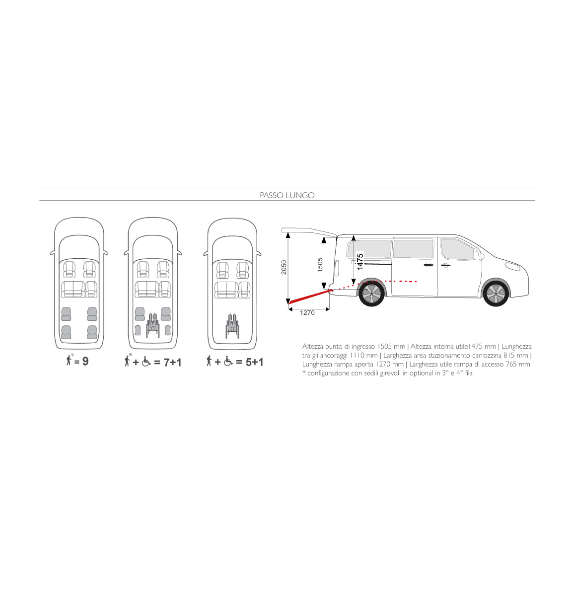 Citroën Spacetourer F-Style con pianale ribassato è disponibile nelle versioni Passo Medio e Passo Lungo, con configurazioni fino a 5 passeggeri più una persona in carrozzina. Progettato per offrire massima versatilità d’uso, è perfetto per famiglie numerose, servizi taxi o NCC. La rampa richiudibile consente di recuperare spazio per i bagagli in assenza della carrozzina, rendendo il veicolo adatto a ogni esigenza.