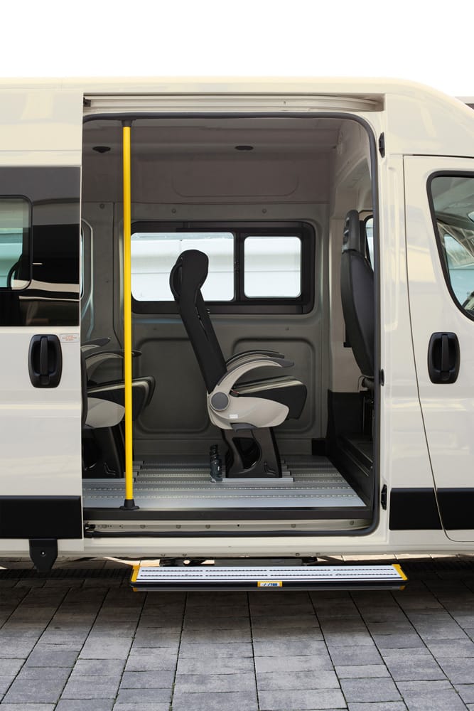 Les minibus Focaccia Group offrent jusqu’à 9 places homologuées M1, configurables en fonction des exigences opérationnelles. Les sièges individuels sont équipés d’un dossier inclinable et de ceintures intégrées, montés sur des glissières pour une reconfiguration facile.