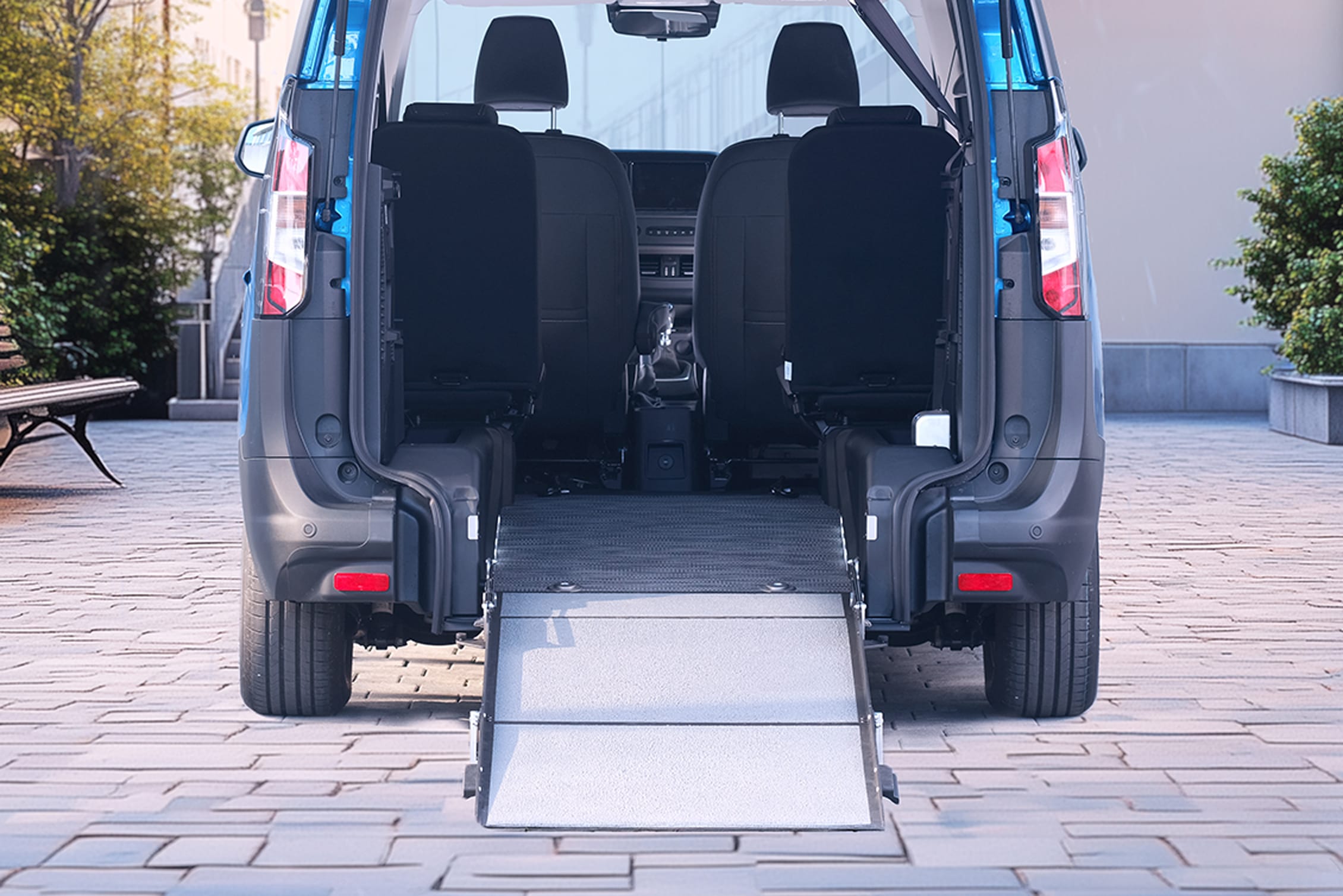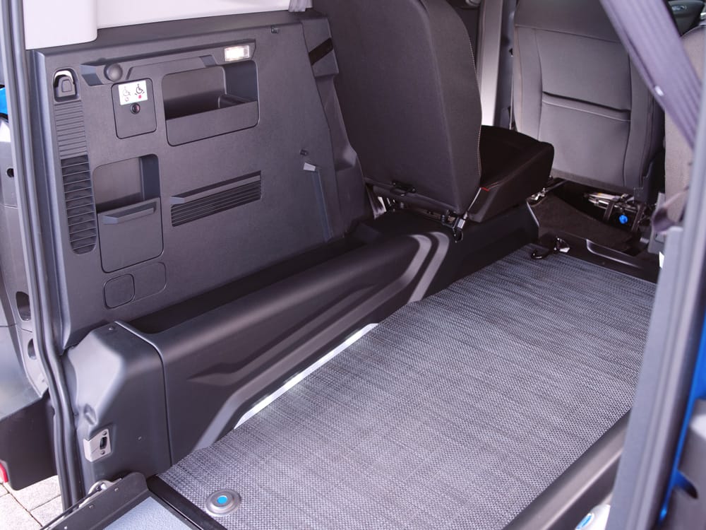 Apertura e chiusura manuale della rampa di accesso sono facili e veloci. Quando la persona in carrozzina non è a bordo, la rampa si ripiega internamente per ricreare il piano di appoggio originario, utile per il posizionamento di oggetti o bagagli.