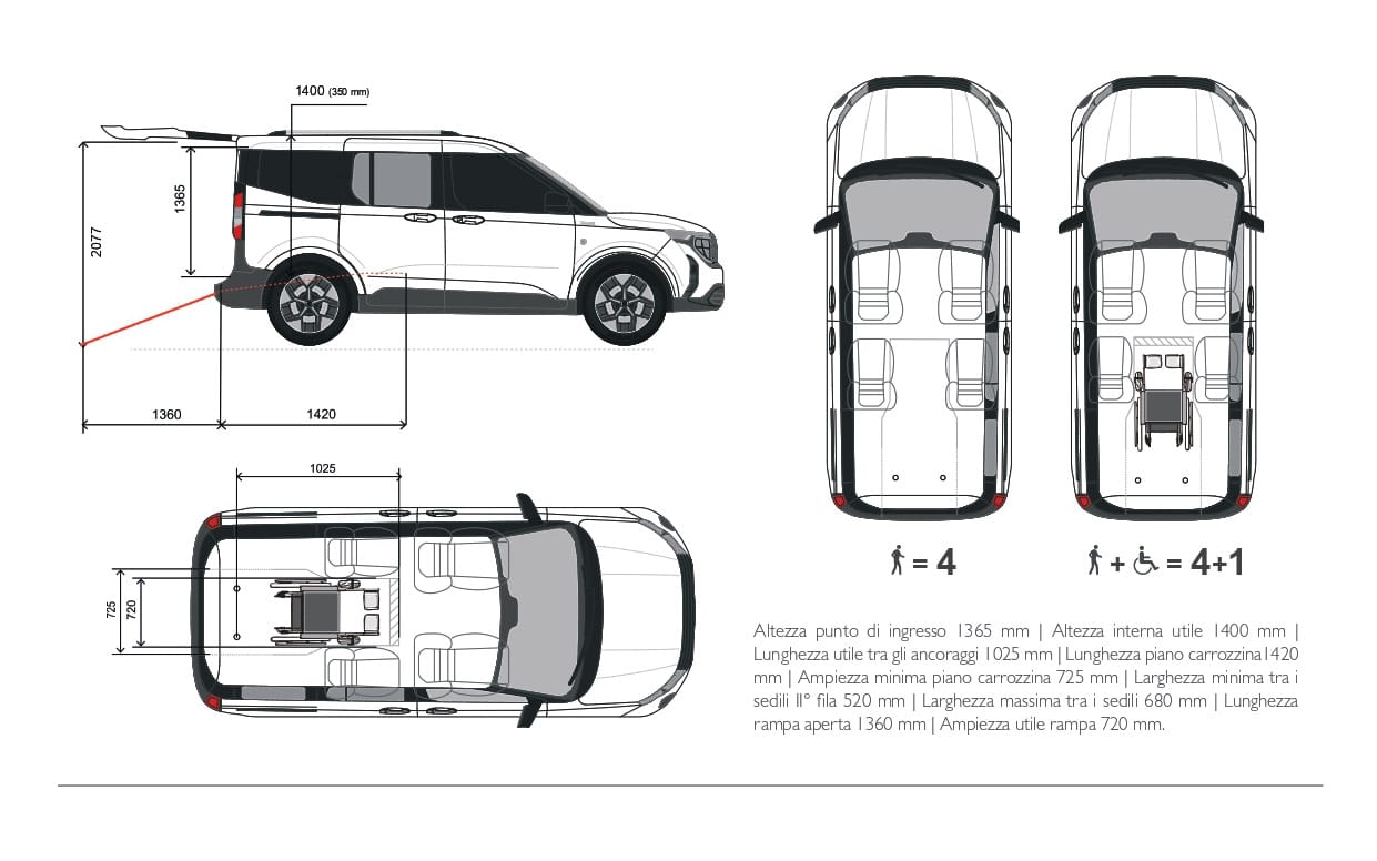 Ford Tourneo Courier F-Style è progettato per gli spostamenti quotidiani e il tempo libero delle famiglie. Il pianale ribassato consente l’accesso diretto tramite rampa leggera e ripiegabile. Gli interni, curati nei dettagli, ospitano 4 passeggeri e 1 persona in carrozzina, garantendo comfort, sicurezza e stile