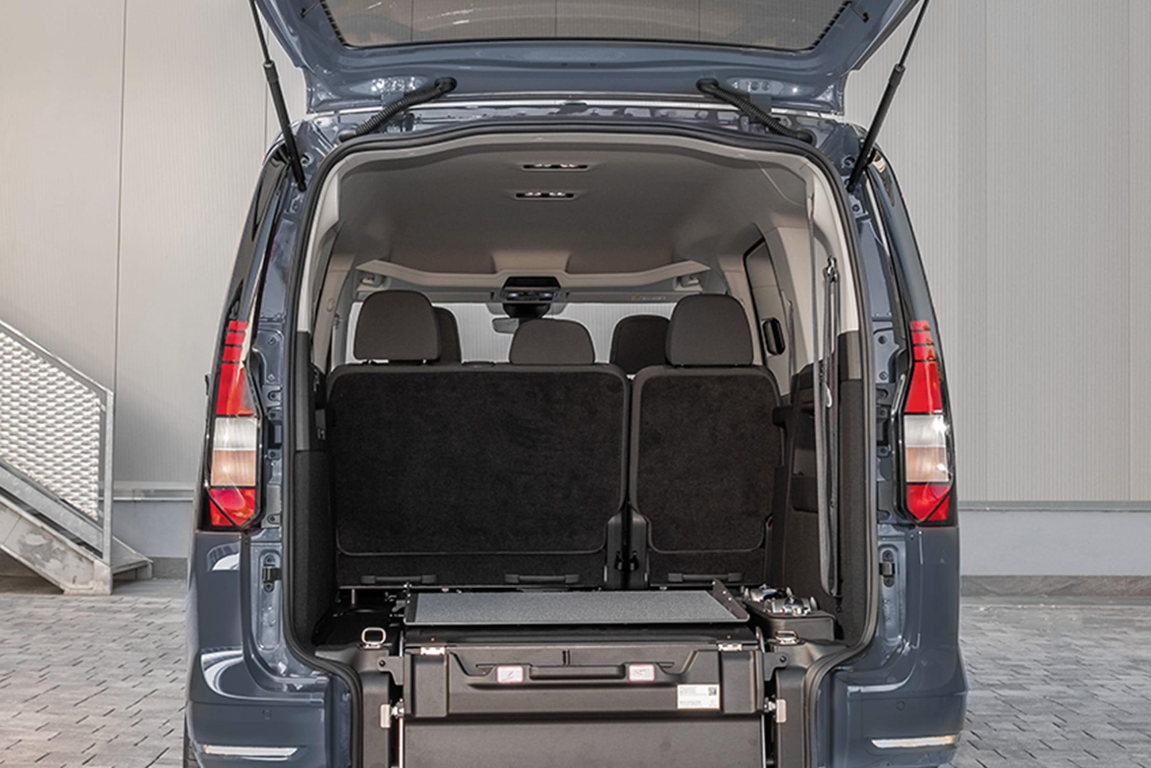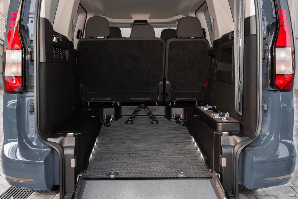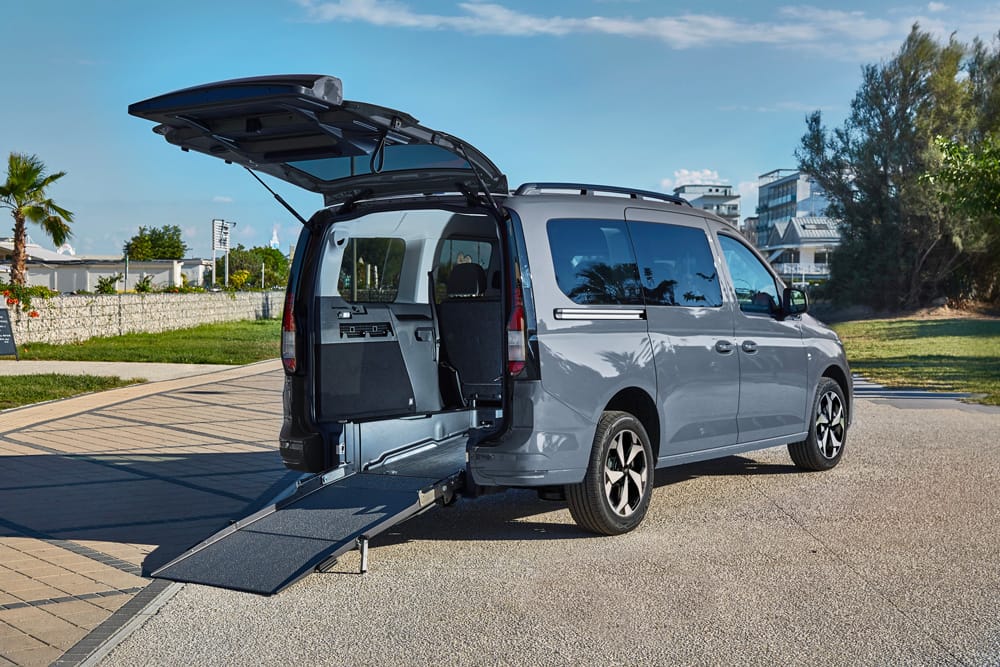 Grand Tourneo Connect massimizza lo spazio disponibile. L’allestimento con pianale ribassato ospita una persona in carrozzina e altri cinque viaggiatori. Il passeggero gode di una zona comoda: l’area di stazionamento della carrozzina è ampia, i sistemi di ancoraggio e la cintura a tre punti rispettano le norme di sicurezza, creando un ambiente accogliente e piacevole. È possibile scegliere un allestimento con sedili girevoli e richiudibili che, in caso di non utilizzo della rampa, garantiscono un totale di 7 posti.