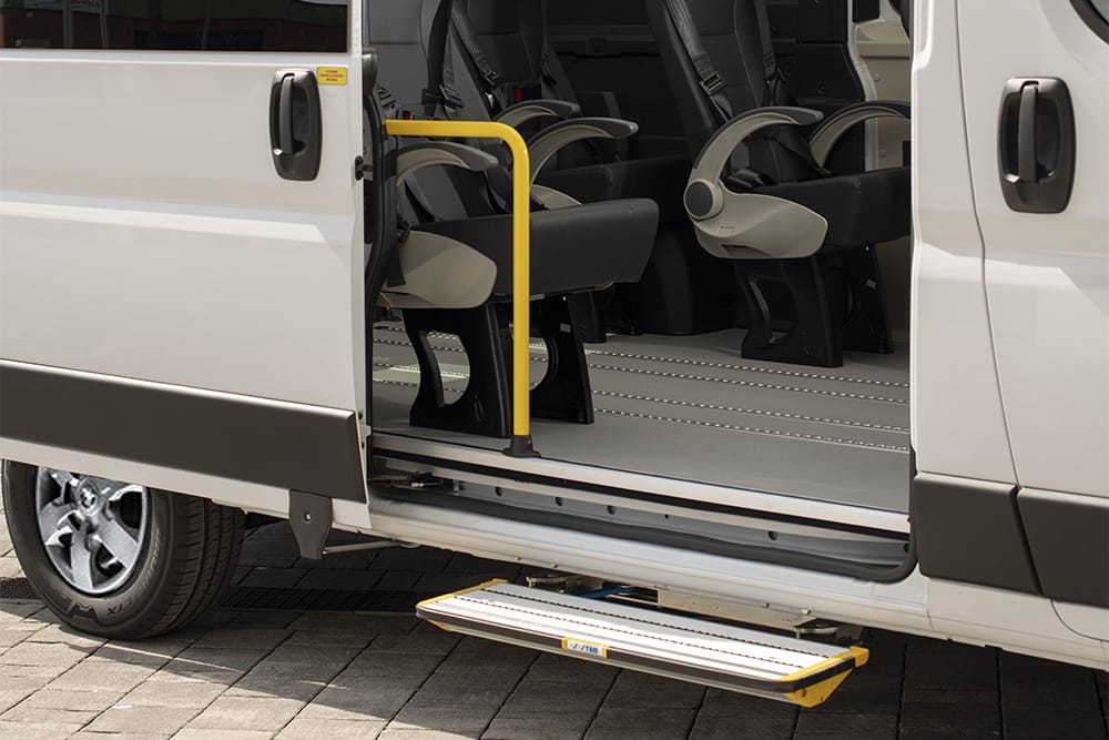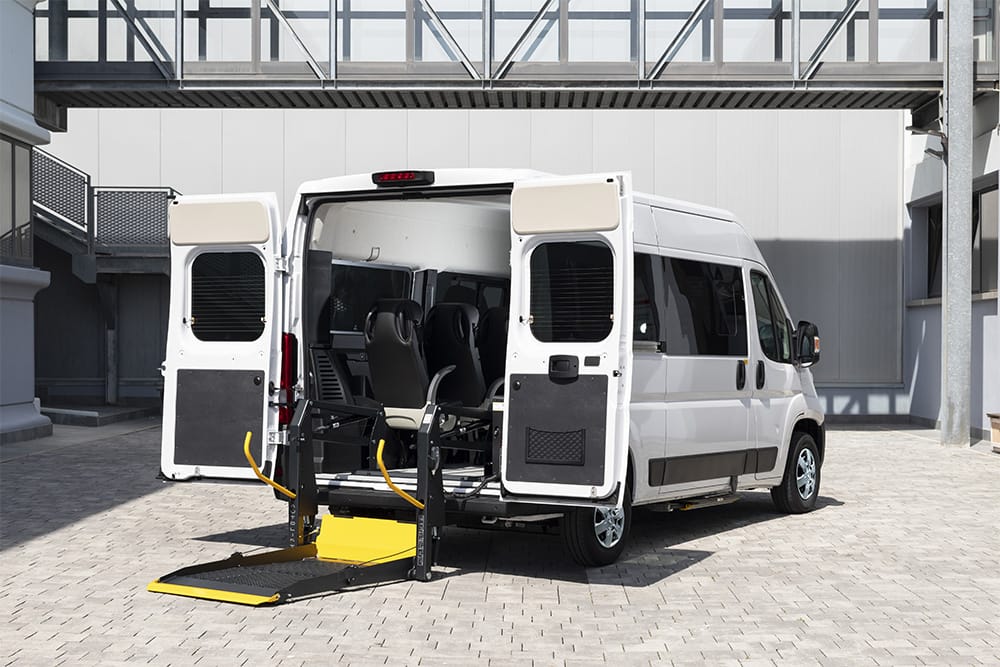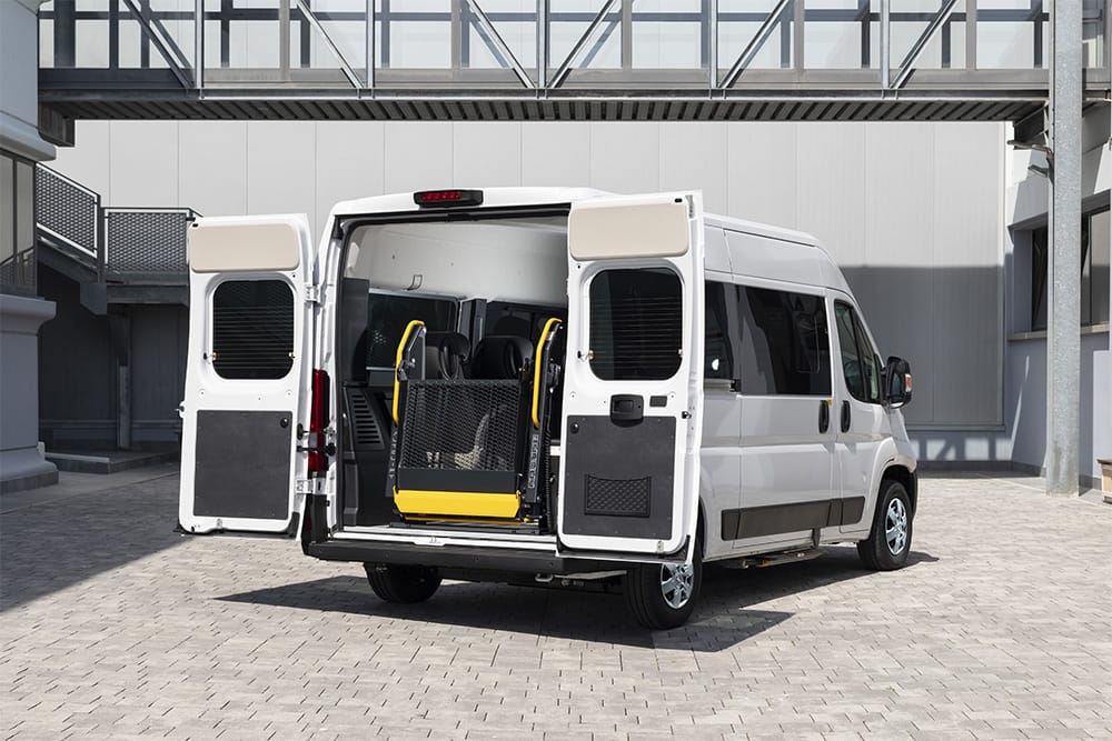 Opel Movano F-Style con sollevatore doppio-braccio è il veicolo ideale per enti, associazioni e operatori del trasporto collettivo. Disponibile in versione Passo Medio o Passo Lungo con tetto alto, accoglie fino a 9 passeggeri o 1-2 carrozzine grazie al pavimento attrezzato F-Floor e ai sedili monoposto su guide. Il sollevatore posteriore elettroidraulico garantisce accesso sicuro anche con carrozzine di grandi dimensioni.