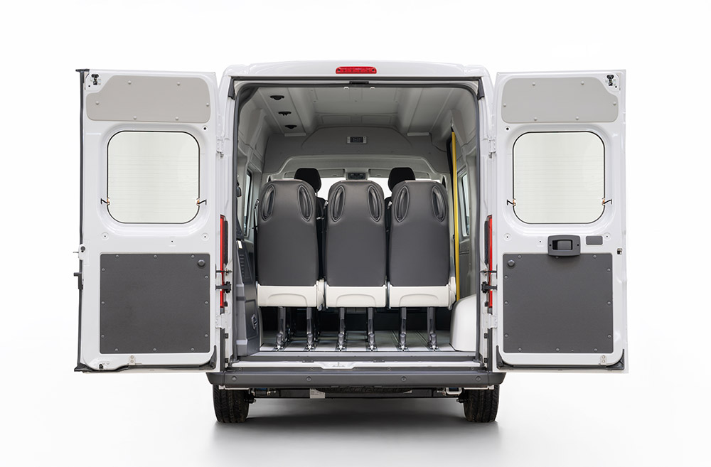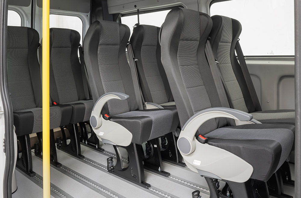 I minibus Focaccia Group offrono fino a 9 posti omologati M1, configurabili in base alle esigenze operative. I sedili singoli sono dotati di schienale reclinabile e cinture integrate, montati su guide per una facile riconfigurazione.