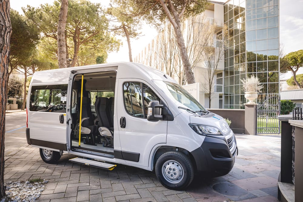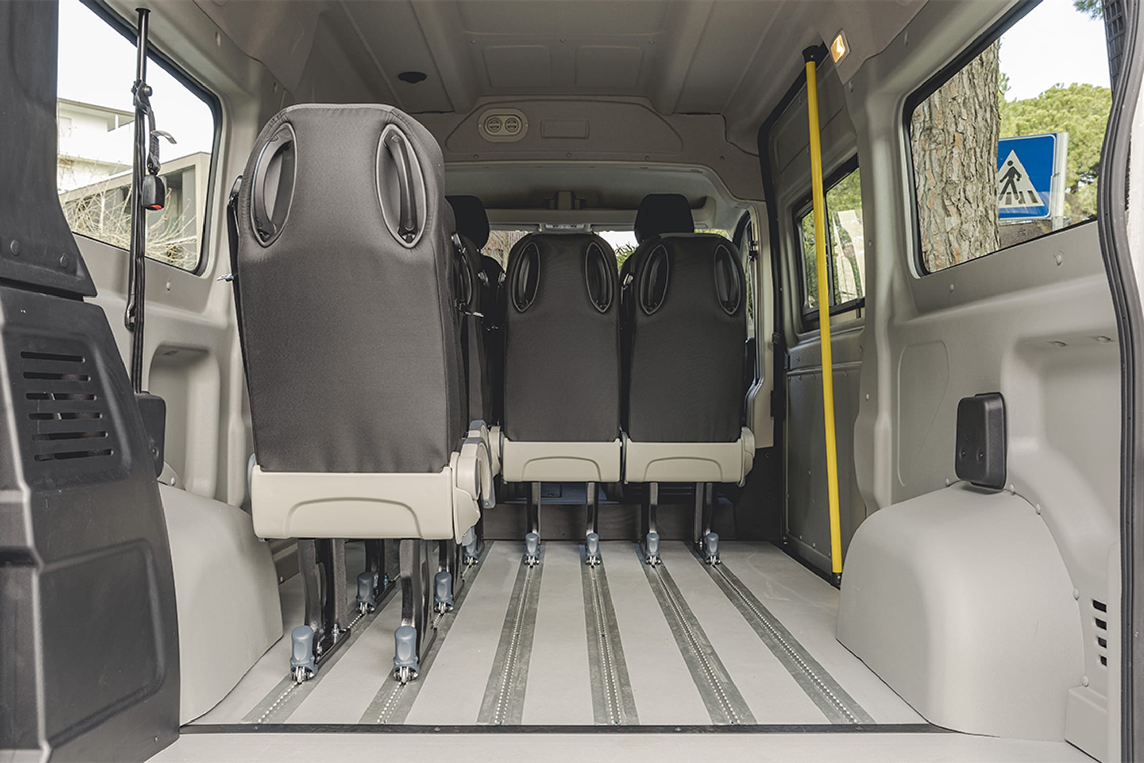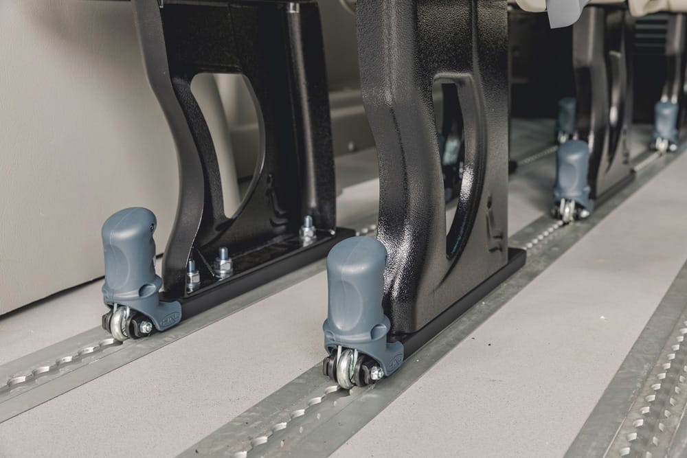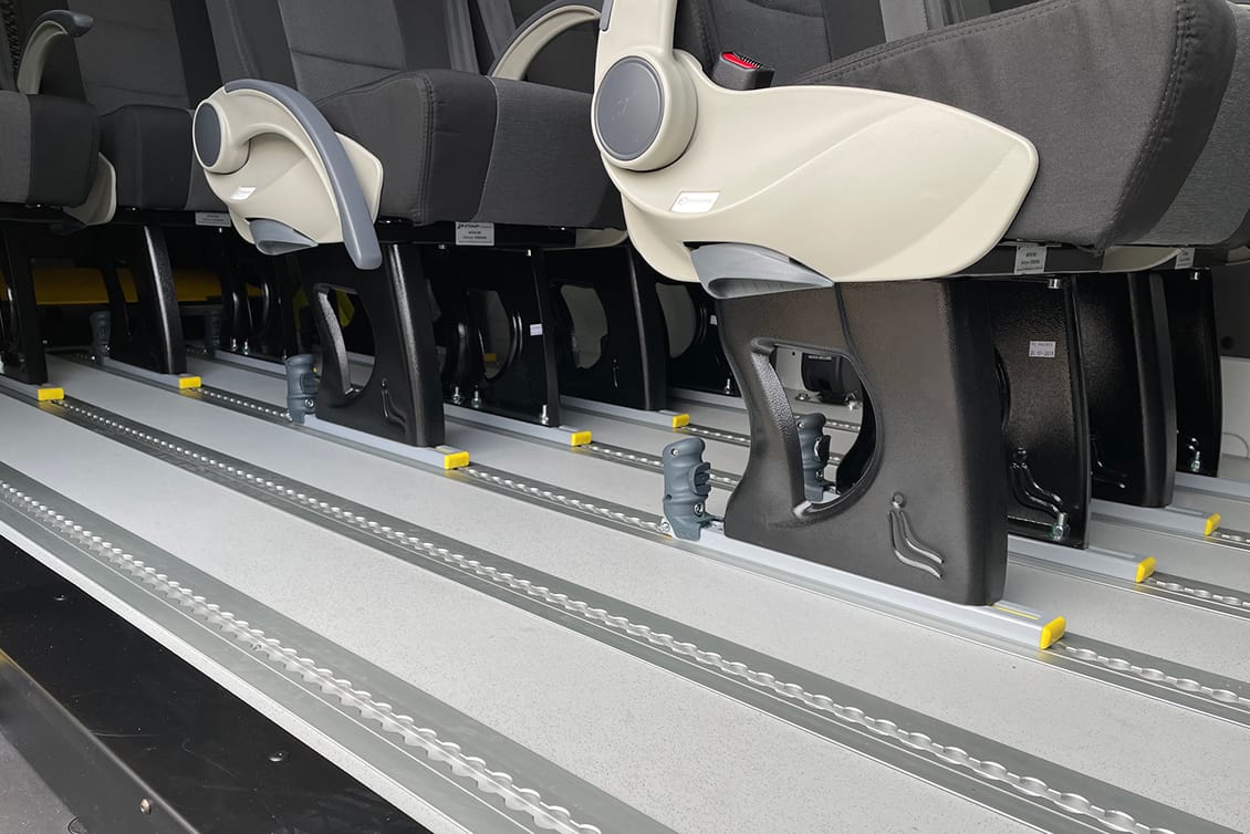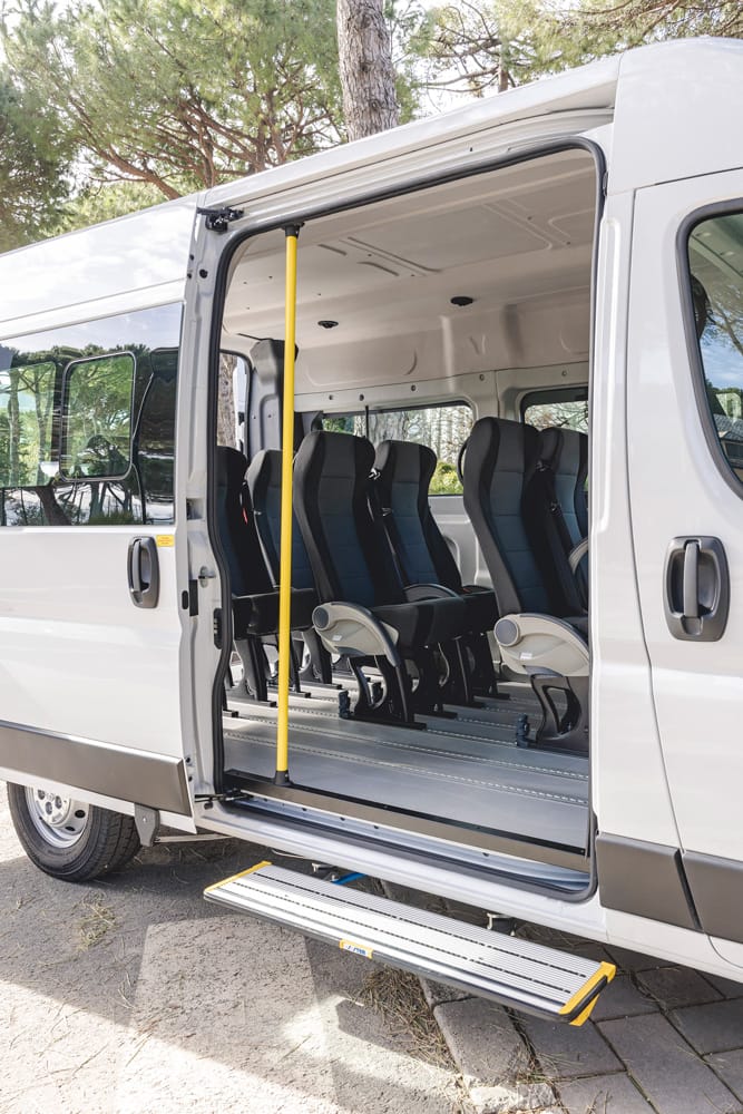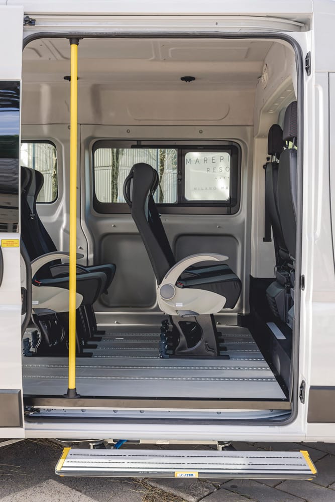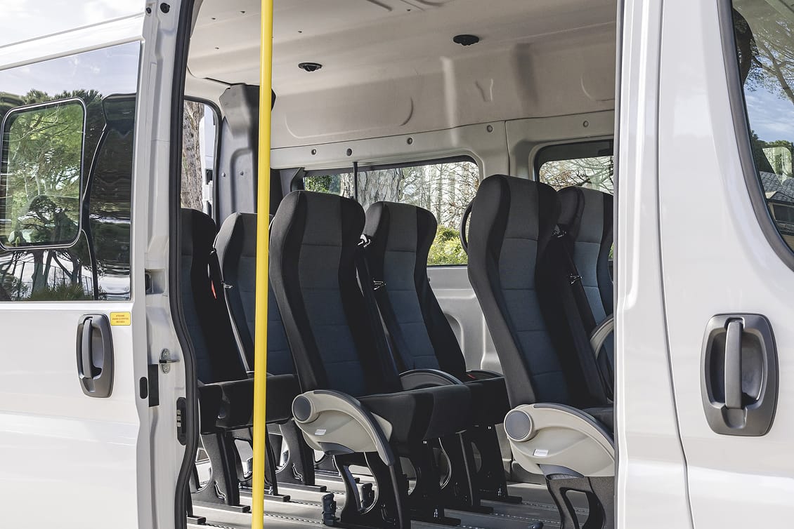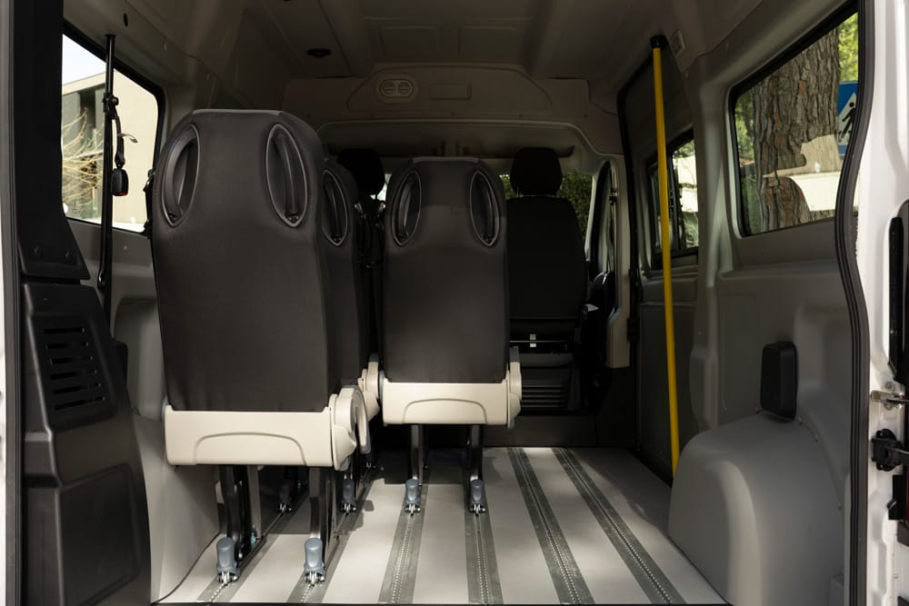 I minibus Focaccia Group offrono fino a 9 posti omologati M1, configurabili in base alle esigenze operative. I sedili singoli sono dotati di schienale reclinabile e cinture integrate, montati su guide per una facile riconfigurazione.