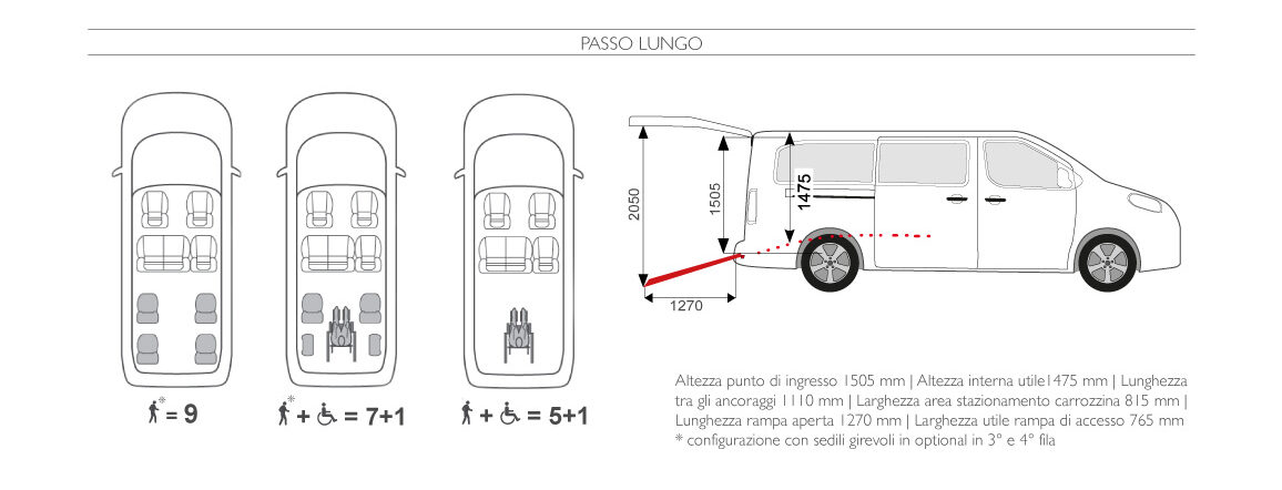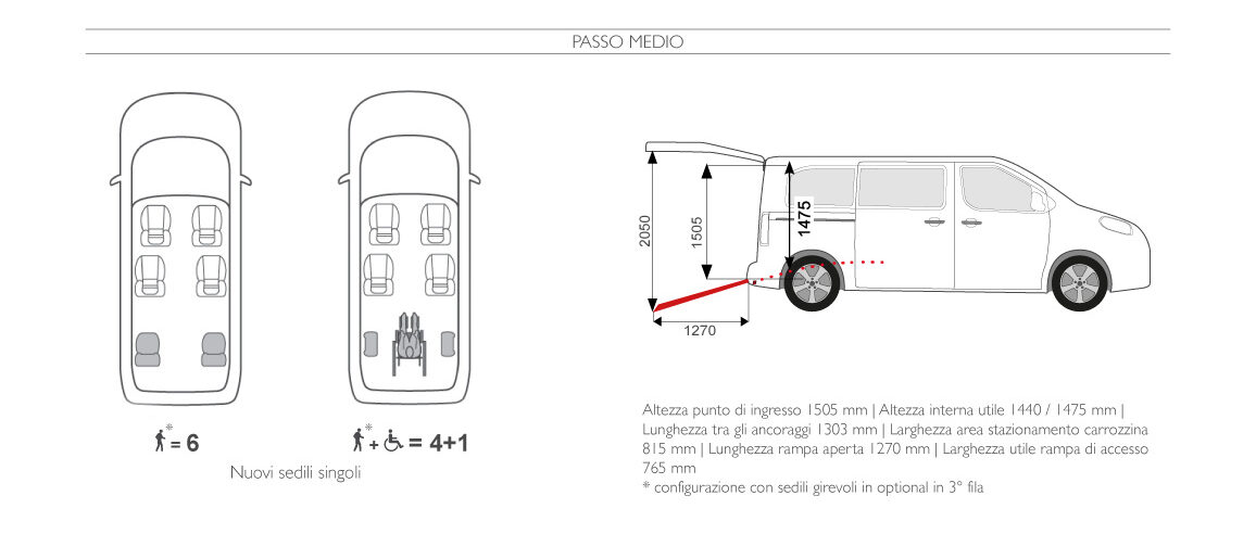 Peugeot Traveller F-Style con pianale ribassato è prodotto in Italia e allestito per offrire massima accessibilità e comfort. Disponibile in versione Passo Medio e Passo Lungo, ospita fino a 5 passeggeri più una persona in carrozzina. Lo spazio dedicato alla carrozzina è ampio e ben integrato, con cinture e fissaggi sicuri per garantire la massima stabilità durante il viaggio. La rampa posteriore ultra-leggera è richiudibile, permettendo il recupero del vano bagagli. Ideale per famiglie, taxi, NCC e trasporto professionale.