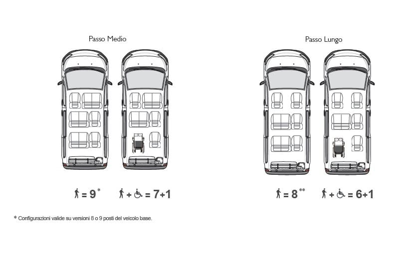 Wheelbase version: Medium Wheelbase / Long Wheelbase Configurations: 6/7 seats + 1 or 8/9 seats in total