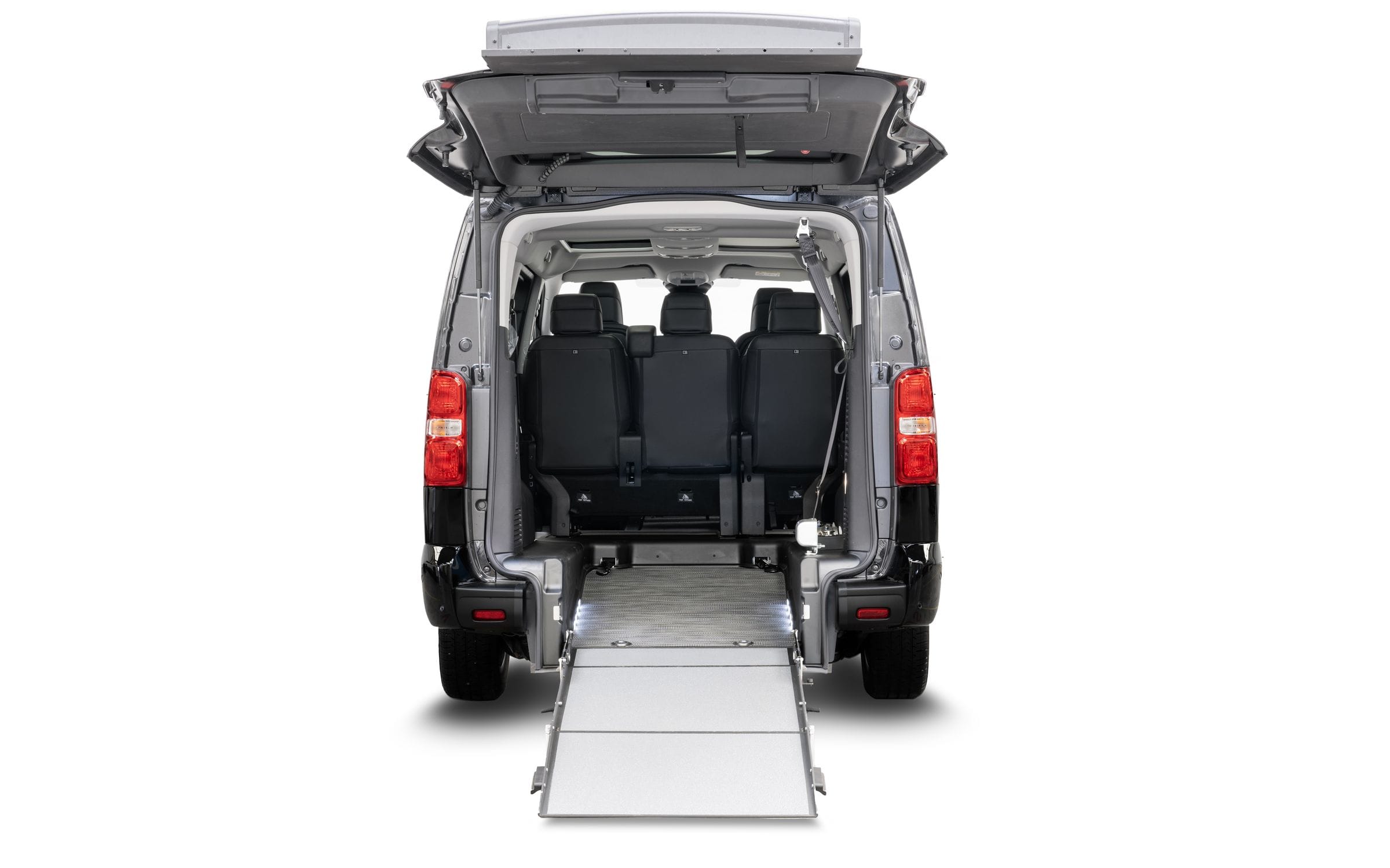 Toyota Proace Verso con pianale ribassato agevola l’accesso a bordo di passeggeri in carrozzina. L’ingresso e l’uscita dal veicolo sono facilitati dalla pratica rampa manuale, mentre il pianale ribassato recupera lo spazio in altezza per ospitare la persona in sedia a rotelle.