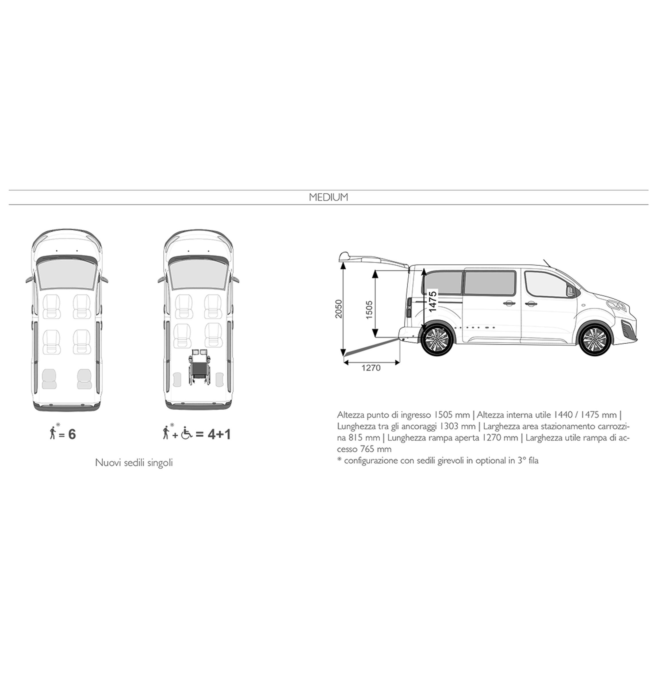 È possibile scegliere un allestimento con sedili girevoli e richiudibili che, in caso di non utilizzo della rampa, garantiscono un totale di 9 posti.