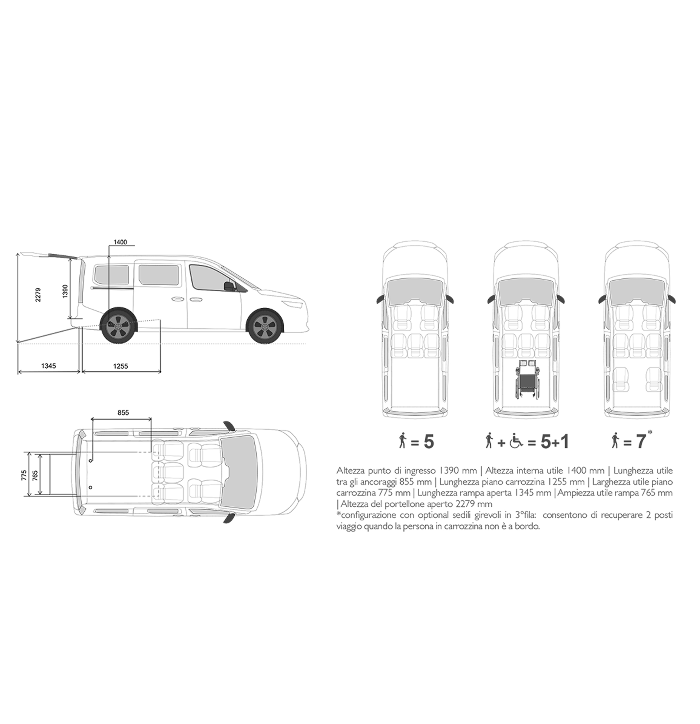 Caddy Maxi F-Style con le sue caratteristiche eleva tutti gli standard: accessibilità, sicurezza e stile su questo veicolo sono al massimo. L’allestimento con pianale ribassato progettato e realizzato interamente in Italia da Focaccia Group ospita cinque passeggeri e una persona con disabilità.