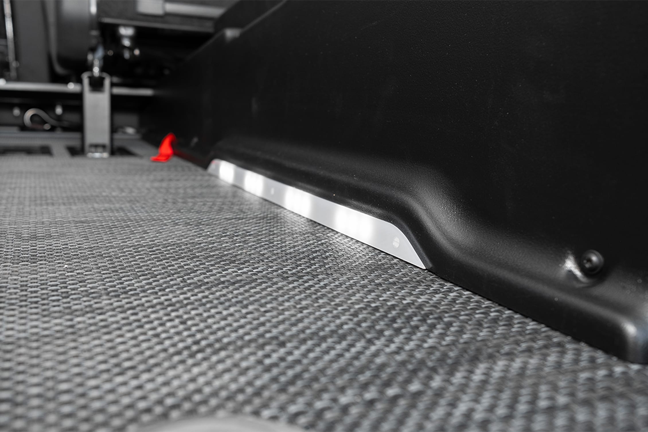 L’allestimento F-Style, progettato e prodotto in Italia, è molto riconoscibile: pavimentazione Hi-Tech, luci LED integrate, rivestimenti interni in ABS automotive, nuovi sedili singoli rivestiti in tessuto abbinati agli interni della vettura.