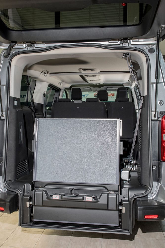 Apertura e chiusura manuale della rampa di accesso sono facili e veloci. Quando la persona in carrozzina non è a bordo, la rampa si ripiega internamente per ricreare il piano di appoggio originario, utile per il posizionamento di oggetti o bagagli.